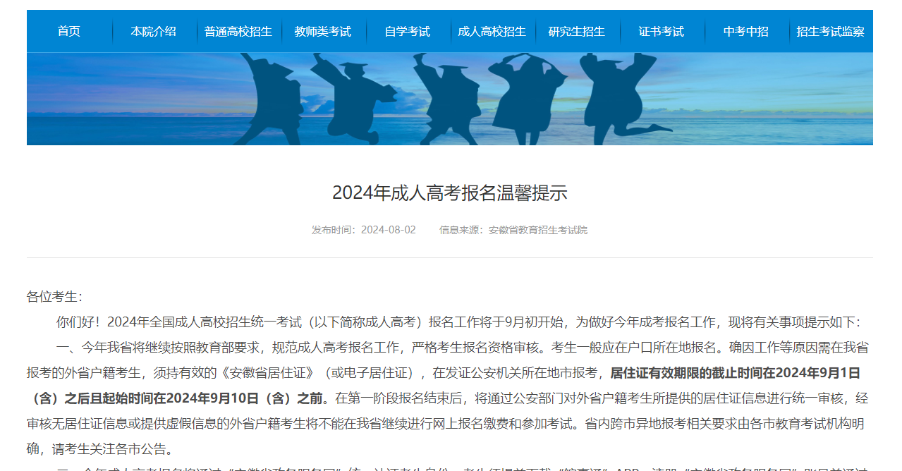 一、今年我省將繼續(xù)按照教育部要求,規(guī)范成人高考報名工作,嚴格考生報名資格審核。考生一般應在戶口所在地報名。確因工作等原因需在我省報考的外省戶籍考生,須持有效的《安徽省居住證》(或電子居住證),在發(fā)證公安機關所在地市報考,居住證有效期限的截止時間在2024年9月1日(含)之后且起始時間在2024年9月10日(含)之前。在第一階段報名結束后,將通過公安部門對外省戶籍考生所提供的居住證信息進行統(tǒng)一審核,經(jīng)審核無居住證信息或提供虛假信息的外省戶籍考生將不能在我省繼續(xù)進行網(wǎng)上報名繳費和參加考試。省內跨市異地報考相關要求由各市教育考試機構明確,請考生關注各市公告。